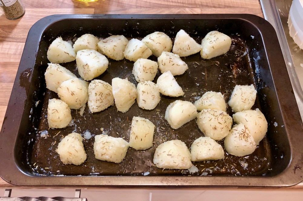 - Sprinkle the salt, pepper, and herbs over your potatoes, then give the pan a good shake to shuffle the potatoes round. To ensure an even covering you may need to manually turn over some of the potatoes.