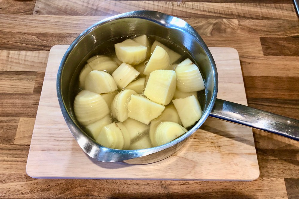 - Place all the potato pieces into your saucepan and cover in cold water.